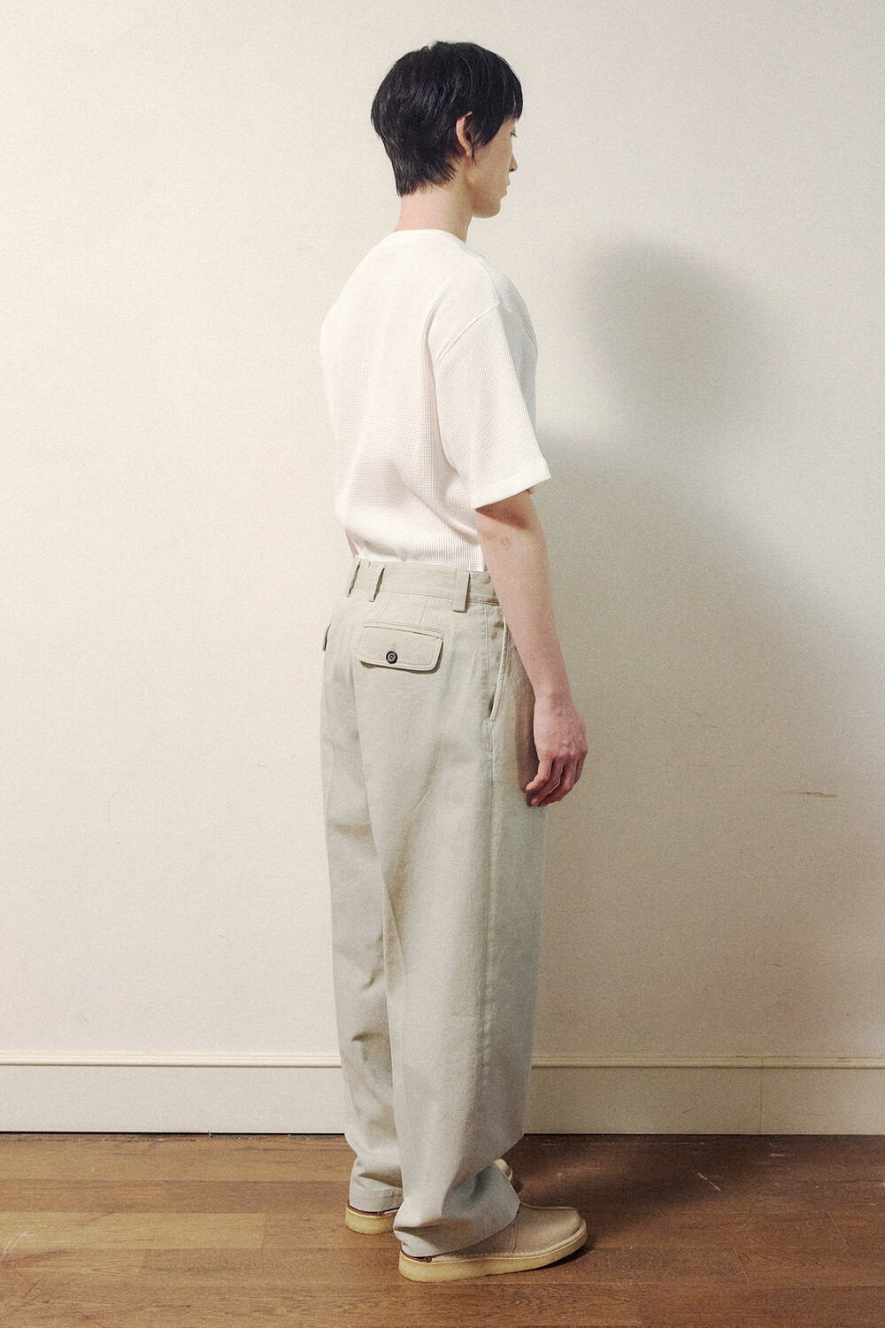 Haku 하쿠 코튼 와이드 팬츠는 ‘하쿠 (はく)’ 에서 유래한 이름으로, 두 가지 의미를 담고 있습니다. 첫 번째는 한자의 穿(하쿠) 로, ‘바지를 입다’라는 행위를 뜻해, 이 아이템의 기능과 본질을 직관적으로 드러냅니다. 두 번째는 白(하쿠)로, ‘흰색’ 을 의미하지만, 단순한 색의 명칭을 넘어 희미하게 번지는 빛, 비워진 여백, 정제된 깨끗함과 같은 감각을 함께 품고 있습니다. 이는 시간과 함께 자연스럽게 빛이 바래고, 표면이 부드럽게 변화하는 소재의 아름다움과도 맞닿아 있습니다.