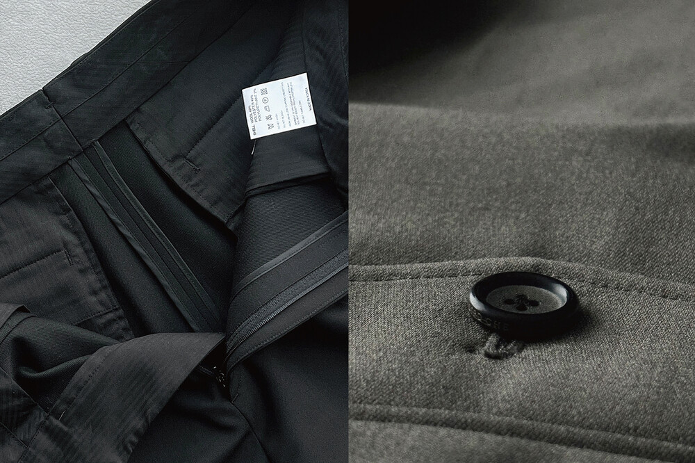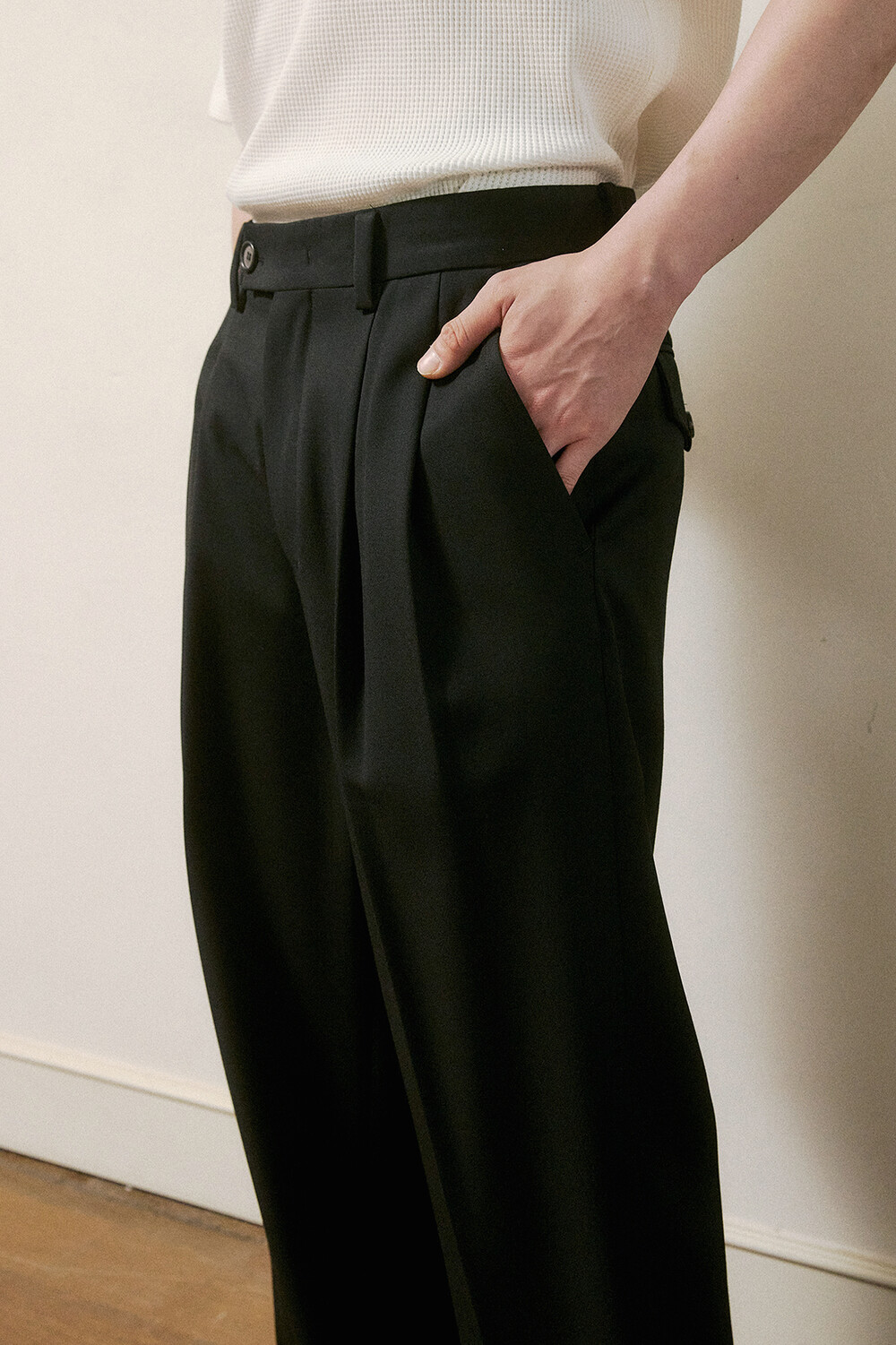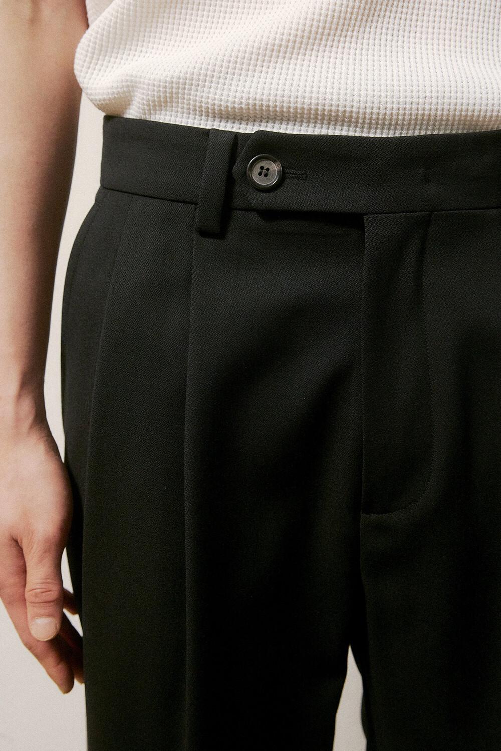 차분한 도브테일 그레이 컬러와 매일매일 다양한 코디에 즐기실수 있는 블랙컬러로 구성했으며 원단은 제작전에 축가공을 거쳐서 고객님께서 후에 옷을 입다가 드라이클리닝을 맡기시더라도 축률이 적도록 진행했습니다. 앞판에 위치한 편안한 2개의 턱 디테일과 탄탄한 심지 & 고시우라로 오랫동안 제품을 즐기셔도 틀어짐이나 늘어남 없이 입으실 수 있습니다.