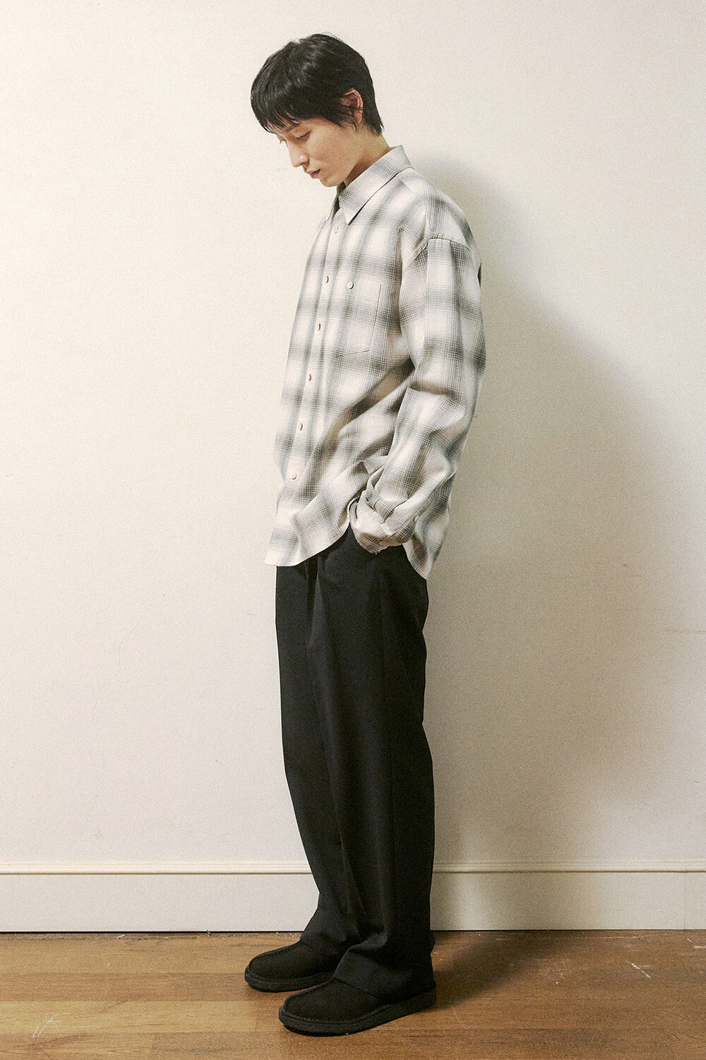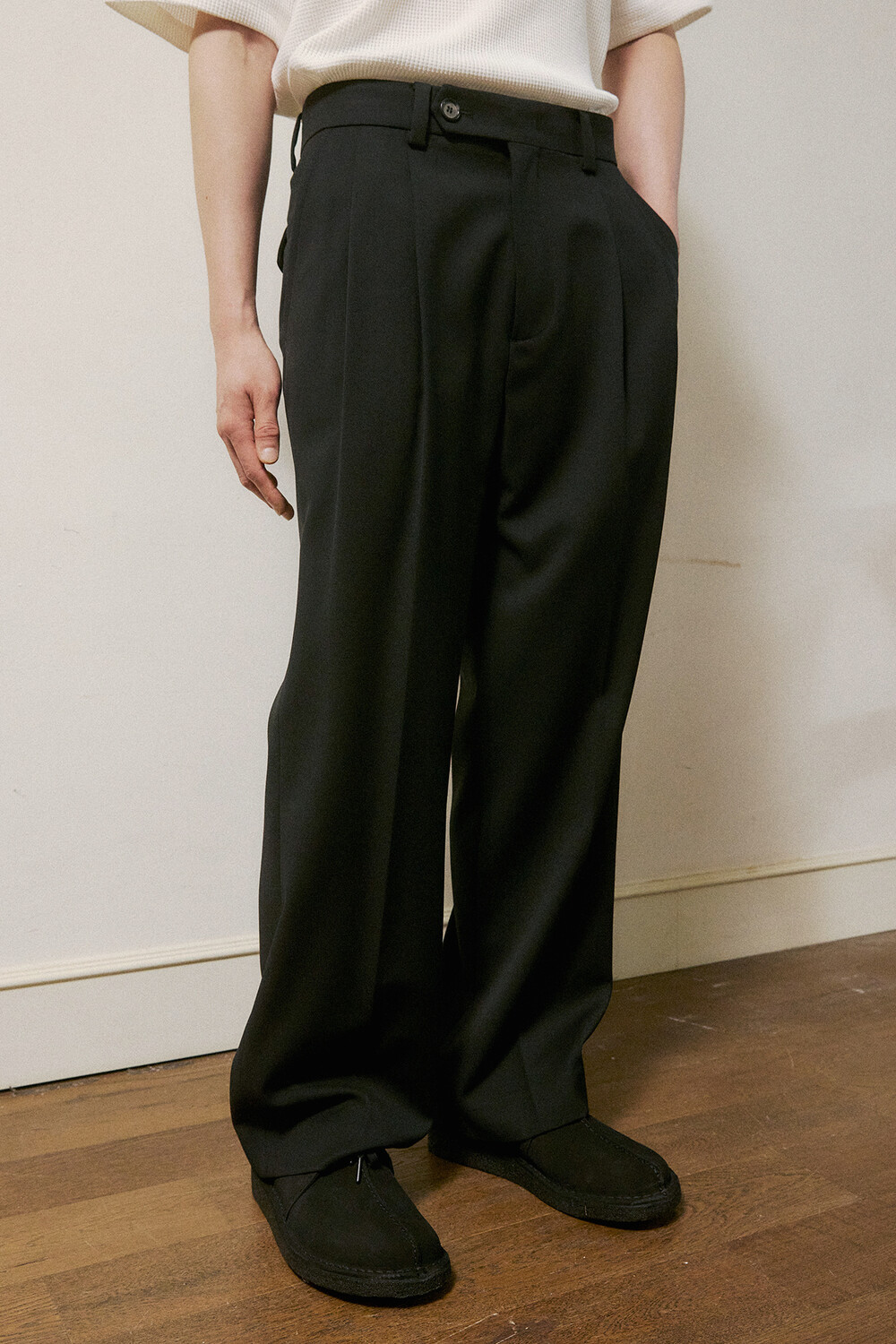 실루엣 특징 | 와이드한 실루엣에 턱 디테일로 편안함을 추가한 울 혼방 팬츠.