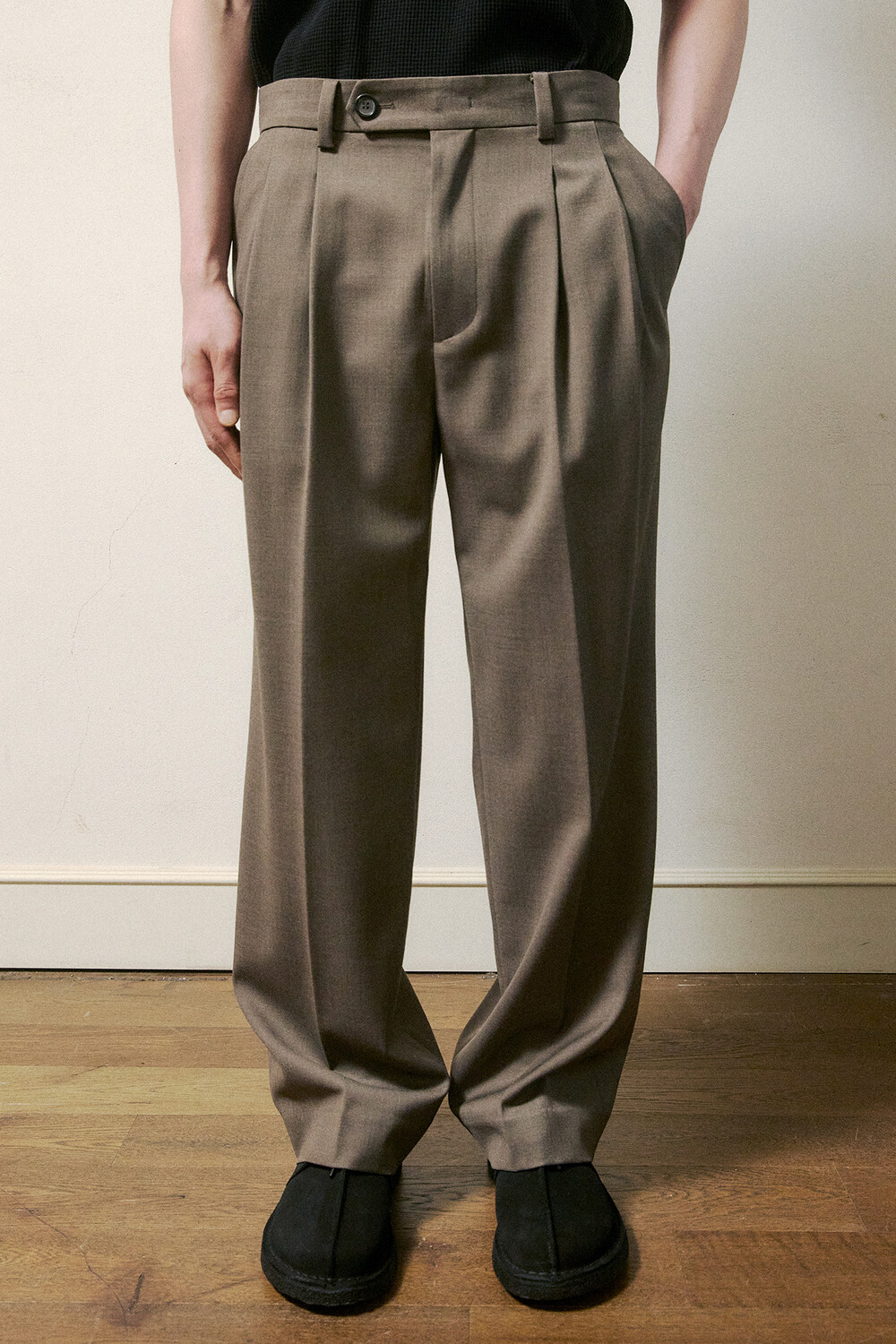 실루엣 특징 | 와이드한 실루엣에 턱 디테일로 편안함을 추가한 울 혼방 팬츠.
