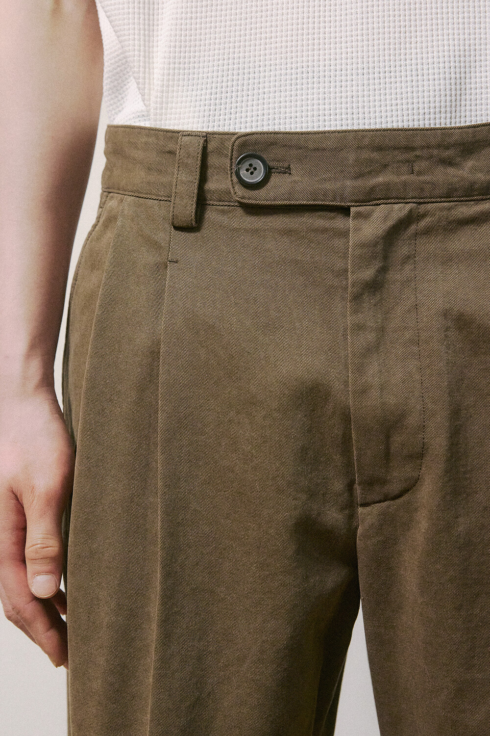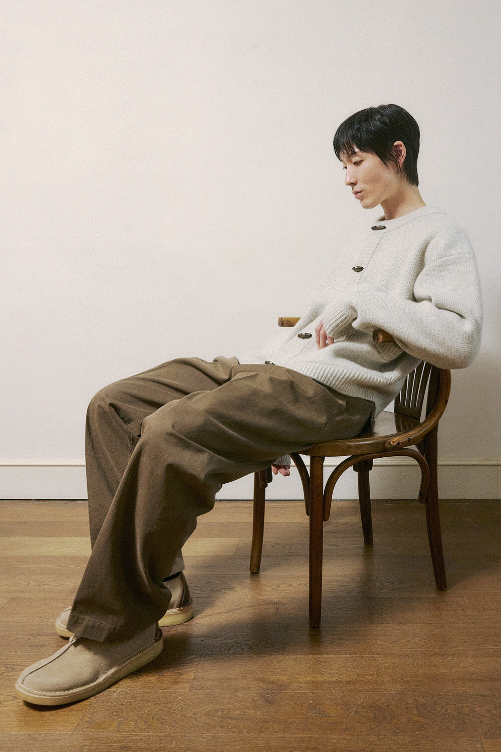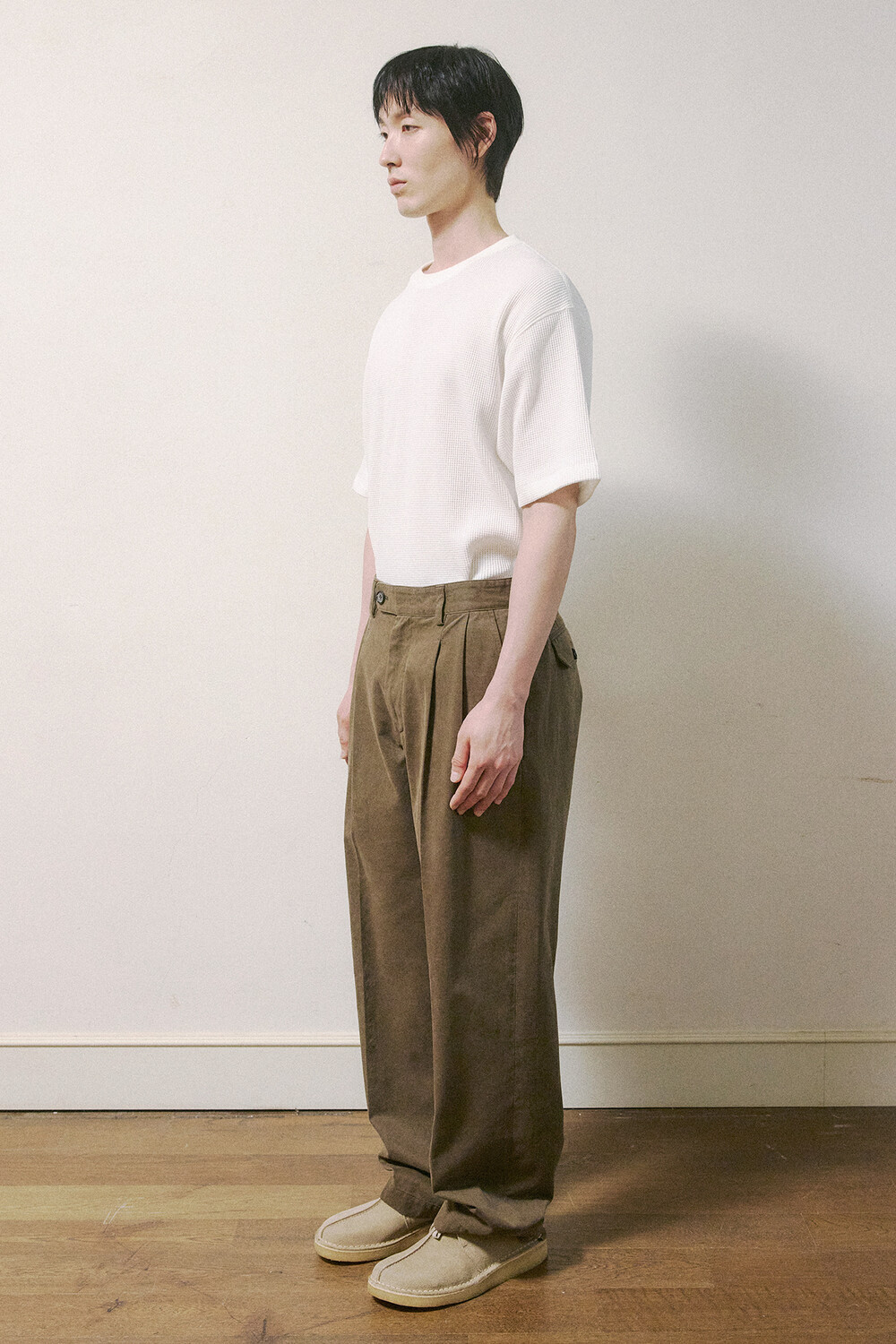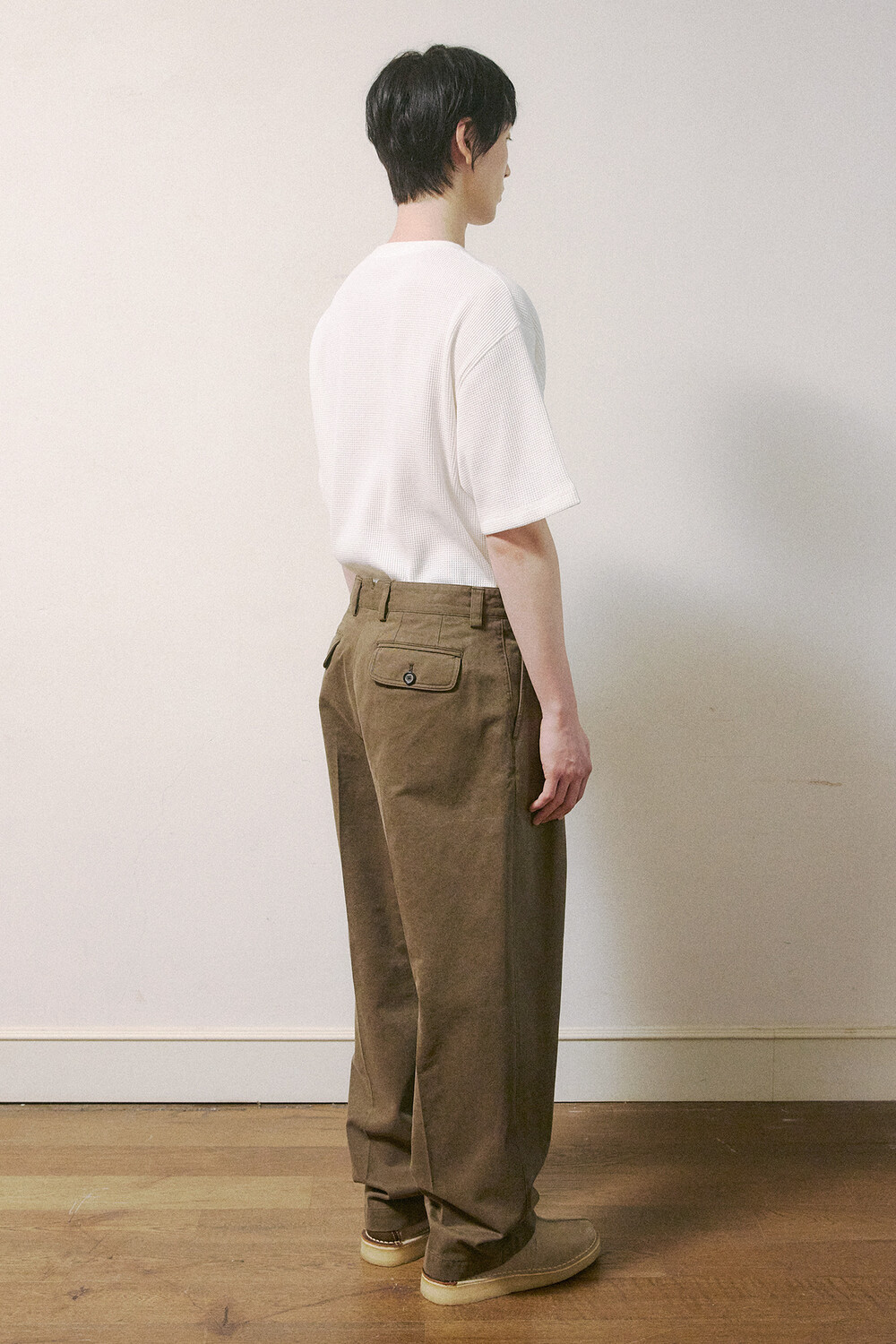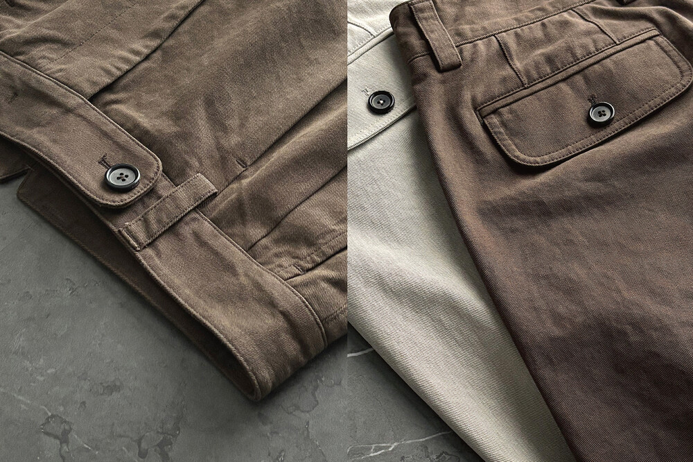컬러에 따라 다른 원단도 선택되었습니다. 세이지 카키 컬러는 아이보리와 베이지 사이의 낮은 채도를 가진 톤을 선택해, 바이오 워싱을 더해 은은하게 바랜 듯한 느낌을 살렸습니다. 다크브라운 컬러는 썰파 염료로 염색한 캐티오닉 코튼을 사용했고, 워싱과 함께 은은한 기모를 더해 부드러운 질감을 완성했습니다. 이처럼 원단과 가공 방식에 변화를 주어 색감과 촉감에서 차이를 만들었고, 착용감과 활용성을 함께 고려해 제작했습니다.