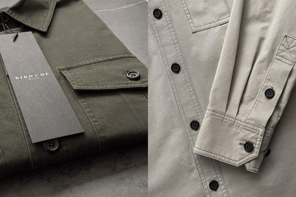 오버사이즈 실루엣으로 설계되어 여유롭고 편안하게 착용할 수 있으며, 셔츠 전면에는 실용성을 높이는 카고포켓 디테일이 적용되어 있으며, 전체적인 봉제와 마감은 내구성을 중시한 설계로 완성되었습니다. 부자재는 ‘BIRD CHE’ 각인 소뿔단추를 사용해 고급스러움을 더했습니다. 단추는 강도와 형태 안정성이 뛰어나 장기간 착용에도 변형이 적으며, 봉제에는 내구성이 우수한 코아사를 사용하여 세탁과 반복 착용에도 봉제선이 쉽게 손상되지 않도록 제작했습니다.