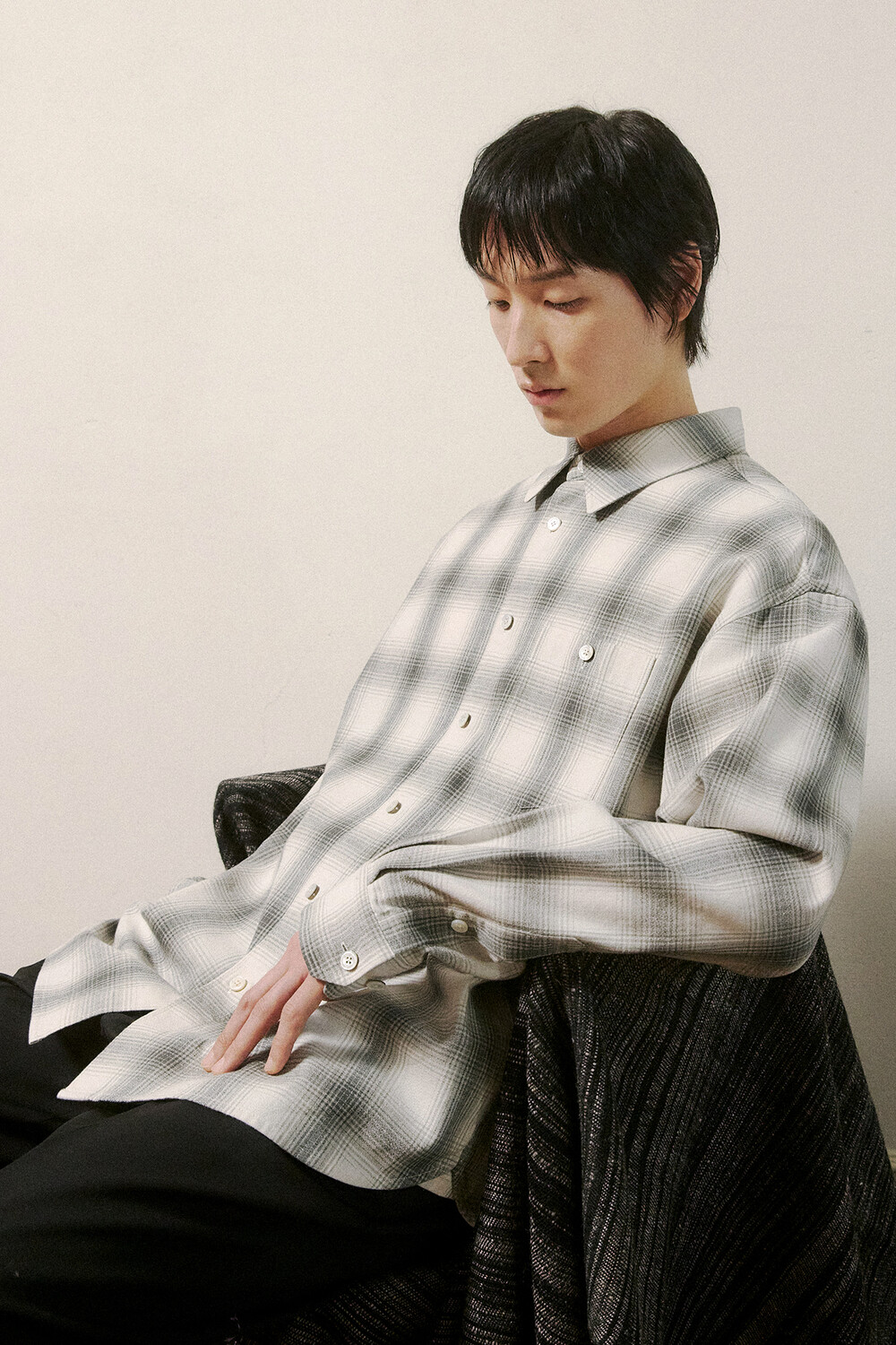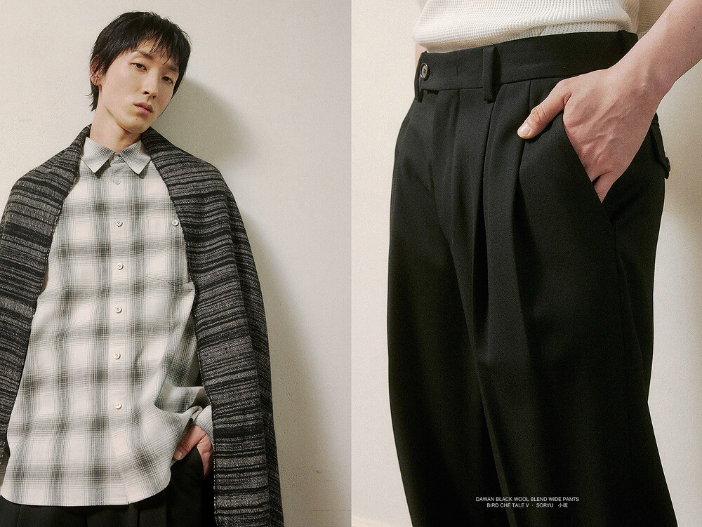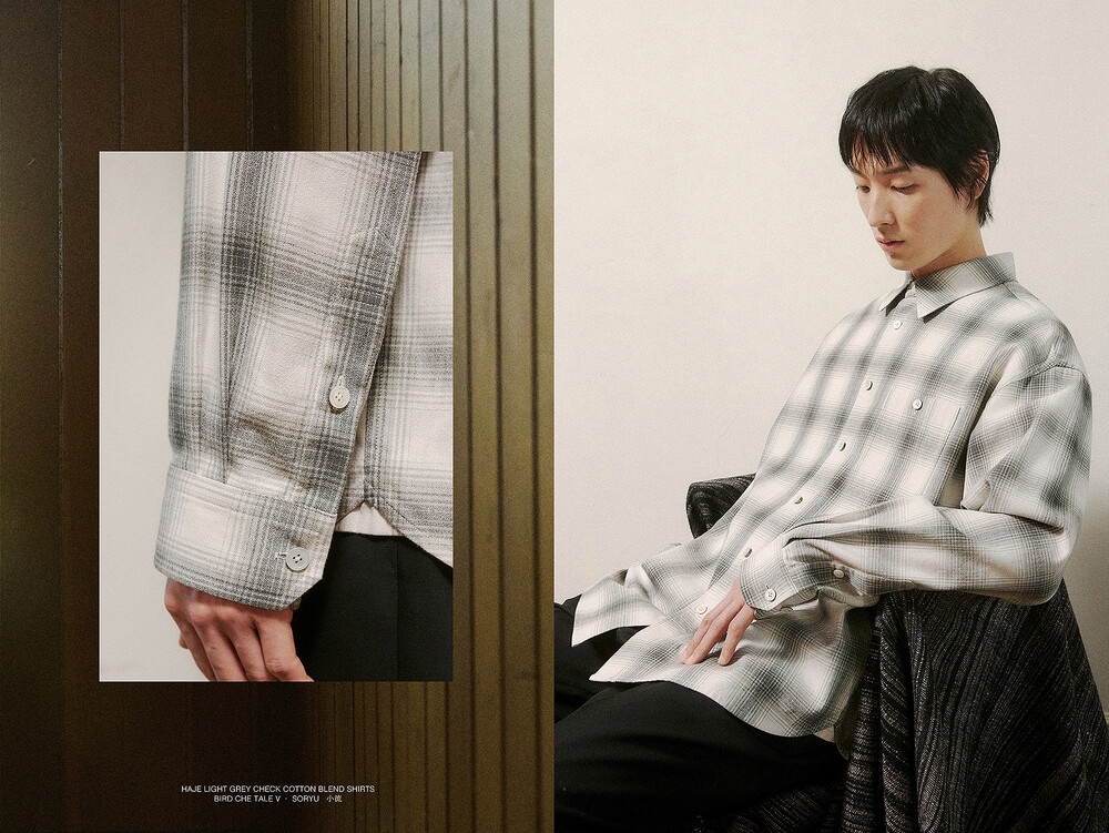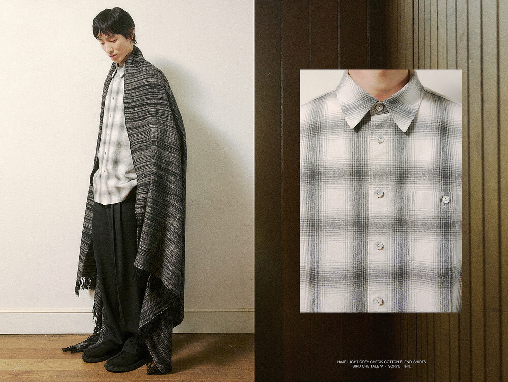 하제 셔츠는 체크 패턴을 기반으로 하여 빈티지한 무드를 담아냈습니다. 일본에서 수입한 코튼원단으로, 밀도감과 터치감에서 좀더 부드러움을 주려고 기획했습니다. 제작 과정에서 워싱 가공을 두 차례 거쳐 축률을 안정화시키는 동시에, 세탁 후에도 변형 없는 실루엣을 완성했습니다. 특히 워싱 처리 과정에서 자연스러운 소재의 질감을 살리려고 했으며 로고 각인된 자개단추를 사용해서 포인트를 주었습니다.