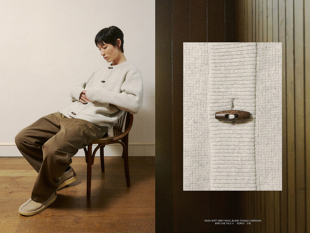 다소 (Daso) 울 블렌드 토글 니트 가디건은 버드 체가 추구하는 '오래도록 함께하는 옷' 이라는 헤리티지에서 출발했습니다. 가벼운 니트 가디건으로 편안하게 걸칠 수 있으며 과하지 않은 절제된 디자인으로 일상에 자연스럽게 녹아들 수 있도록 기획했습니다. 유행을 타지 않는 편안하며 무던한 실루엣과 라쿤 & 캐시미어 천연섬유가 주는 은은한 매력은 입을수록 깊어지는 멋을 선사하며, 시간이 지나도 변치 않는 가치를 담아내었습니다.